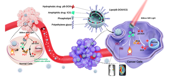 为实现药物的精准释放与可控激活,程泽能教授团队设计了一种多柔比星前药pB-DOX,进一步将pB-DOX与光敏剂ICG共载于纳米脂质体,通过ICG的荧光成像和光声成像性能监测纳米脂质体在肿瘤部位的蓄积。给予808 nm的近红外光照射后,ICG生成的活性氧(ROS)发挥PDT作用;同时,ROS触发pB-DOXROS敏感键断裂,发挥化疗作用。该纳米药物在体循环和非肿瘤组织中低毒,在靶点按需释药以实现化疗和PDT的协同治疗,为智能响应药物递送系统向临床转化提供了新思路。该论文以“ROS-responsive liposomes with NIR light-triggered doxorubicin release for combinatorial therapy of breast cancer”为题发表于《Journal of Nanobiotechnology》杂志,论文第一作者为2017级博士研究生易汉希,该研究得到国家自然科学基金资助。
