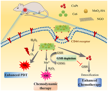 与此同时,丁劲松-周文虎教授团队构建了一种复合型的MnO2缀合氧化石墨烯片状纳米体系共递送光敏剂Chlorin e6及化疗药物顺铂,并修饰透明质酸(HA作为稳定剂及靶向配体。在该复合体系中,MnO2催化产氧及消耗内源性谷胱甘肽;还原产物Mn2+通过芬顿效应发挥化学动力学治疗作用;该工作展现出肿瘤微环境调控型纳米递药体系用于联合治疗的巨大潜力,为设计多功能纳米递药系统用于增强型化疗-光动力联合治疗提供了一种新的思路。本论文以“A Smart MnO2 Doped Graphene Oxide Nanosheet for Enhanced Chemo-Photodynamic Combinatorial Therapy via Simultaneous Oxygenation and Glutathione”为题发表于国产卓越期刊《Acta Pharmaceutica Sinica B》上。论文第一作者为2018级博士研究生刘鹏,该研究得到yl7703永利集团科研启动基金、yl7703永利集团创新驱动基金、湖南省科协青年人才托举工程和国家自然科学基金资助。