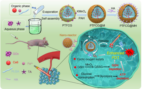 针对光动力治疗的临床应用瓶颈,如肿瘤乏氧,抗氧化系统及ATP依赖的获得性耐受,丁劲松-周文虎教授团队构建了一种循环性纳米“反应器”,旨在克服多种耐受机制,增强光动力治疗效果。将葡萄糖氧化酶及光敏剂Chlorin e6包载到团队首创的核壳纳米自组装体中,并缀合MnO2及包覆透明质酸,形成循环性纳米“反应器”。该纳米反应器可主动靶向至肿瘤组织并被肿瘤细胞摄取。通过葡萄糖氧化酶催化消耗葡萄糖抑制ATP的合成,并产生过氧化氢用于循坏供氧,从而缓解肿瘤乏氧状态。此外,MnO2可消耗内源性谷胱甘肽,破坏肿瘤的抗氧化系统。通过上述机制,纳米反应器可敏化光动力治疗,取得最大化的肿瘤治疗效果。该研究为克服光动力治疗耐受提供了一种新的思路,推进了光动力治疗的临床转化。该论文以“A Cyclic Nano-reactor Achieving Enhanced Photodynamic Tumor Therapy by Reversing Multiple Resistances”为题发表于《Journal of Nanobiotechnology》杂志,论文第一作者为2018级博士研究生刘鹏,该研究得到yl7703永利集团科研启动基金、yl7703永利集团创新驱动基金、湖南省科协青年人才托举工程和国家自然科学基金资助。