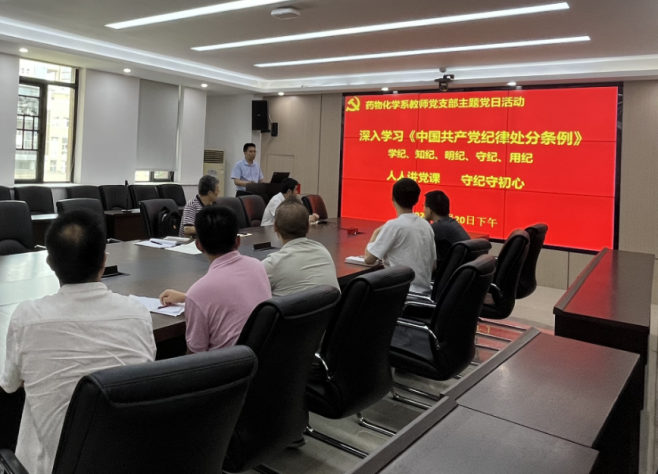 药物化学系教师党支部在前期学校组织的师生党员基本培训两轮培训和党员自学的基础上,于2024年6月20日下午精心组织了一场“人人讲党课 守纪守初心”主题党日活动,推动学习《中国共产党纪律处分条例》走深走实。